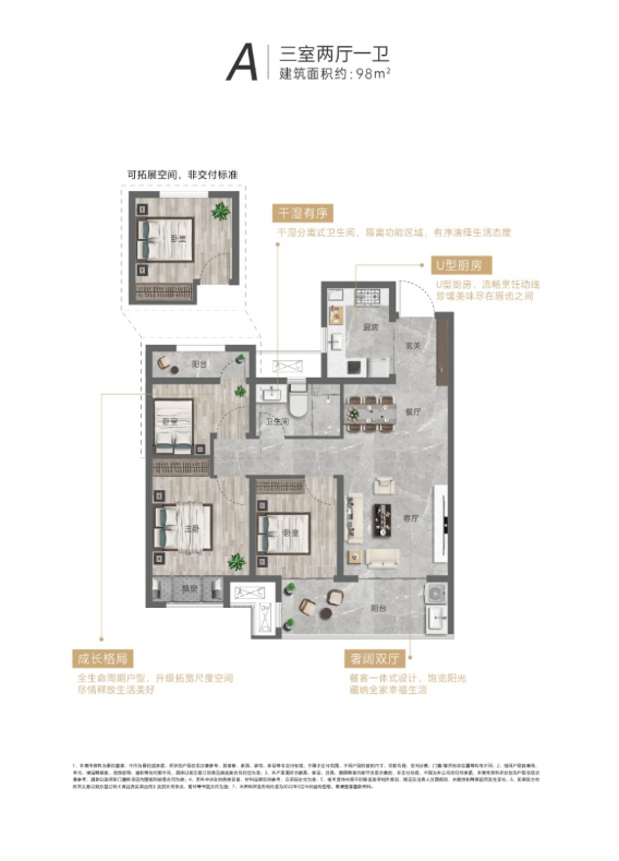 三居室户型定位 “改善首选、舒适宜居”,建筑面积适中,空间布局更加开阔合理,注重居住的舒适度与功能性。户型采用动静分区的设计,将客厅、餐厅、厨房等公共活动区域与卧室、书房等私密休息区域有效分离,既保证了公共区域的活动空间,又不影响私密区域的安静与舒适。客厅与餐厅相连,形成开阔的一体化空间,搭配南向全景阳台,采光通风极佳,视野开阔,能够容纳更多亲友聚会。主卧采用套房设计,配备独立卫生间与衣帽间,为业主提供私密舒适的居住体验;次卧空间宽敞,采光良好,可根据需求作为儿童房、长辈房或客房;书房空间静谧,采光充足,是办公学习、修身养性的理想场所。厨房采用 U 型布局,储物空间充足,操作便利,与餐厅相邻,方便菜品传递;公共卫生间同样采用干湿分离设计,使用便捷,满足家庭日常需求。